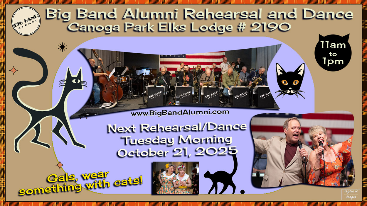 Join us for the Big Band Alumni’s Tuesday morning rehearsal in Canoga Park. Dance to a 17-piece big band and vocalists Bill A. Jones and Nancy Osborne. The fun begins at 11am. Our next rehearsal and dance is Tuesday morning, October 7, 2025. See you there!