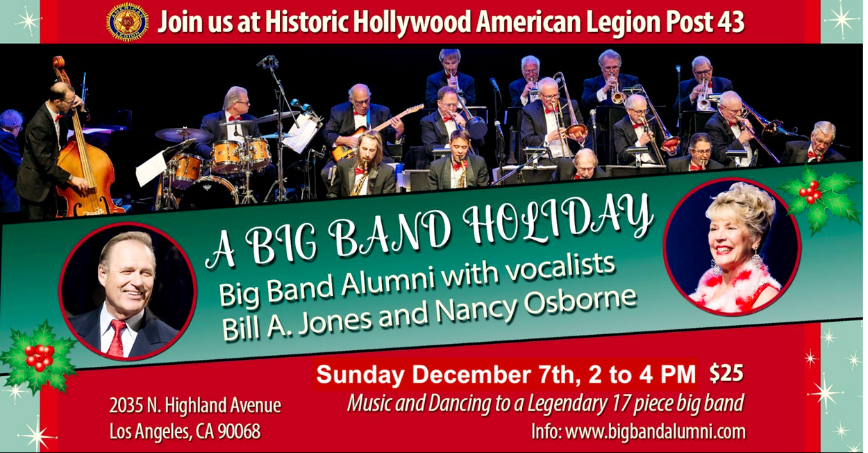 Holiday Show SAVE SUNDAY DECEMBER 7TH, 2 to 4 PM – for A BIG BAND HOLIDAY!!All your favorite Songs of the Season – performed by the legendary 17 piece Big Band Alumni, Bill A. Jones, and Nancy Osborne! If you are a Christmas Music Lover, this is a Must Go!!