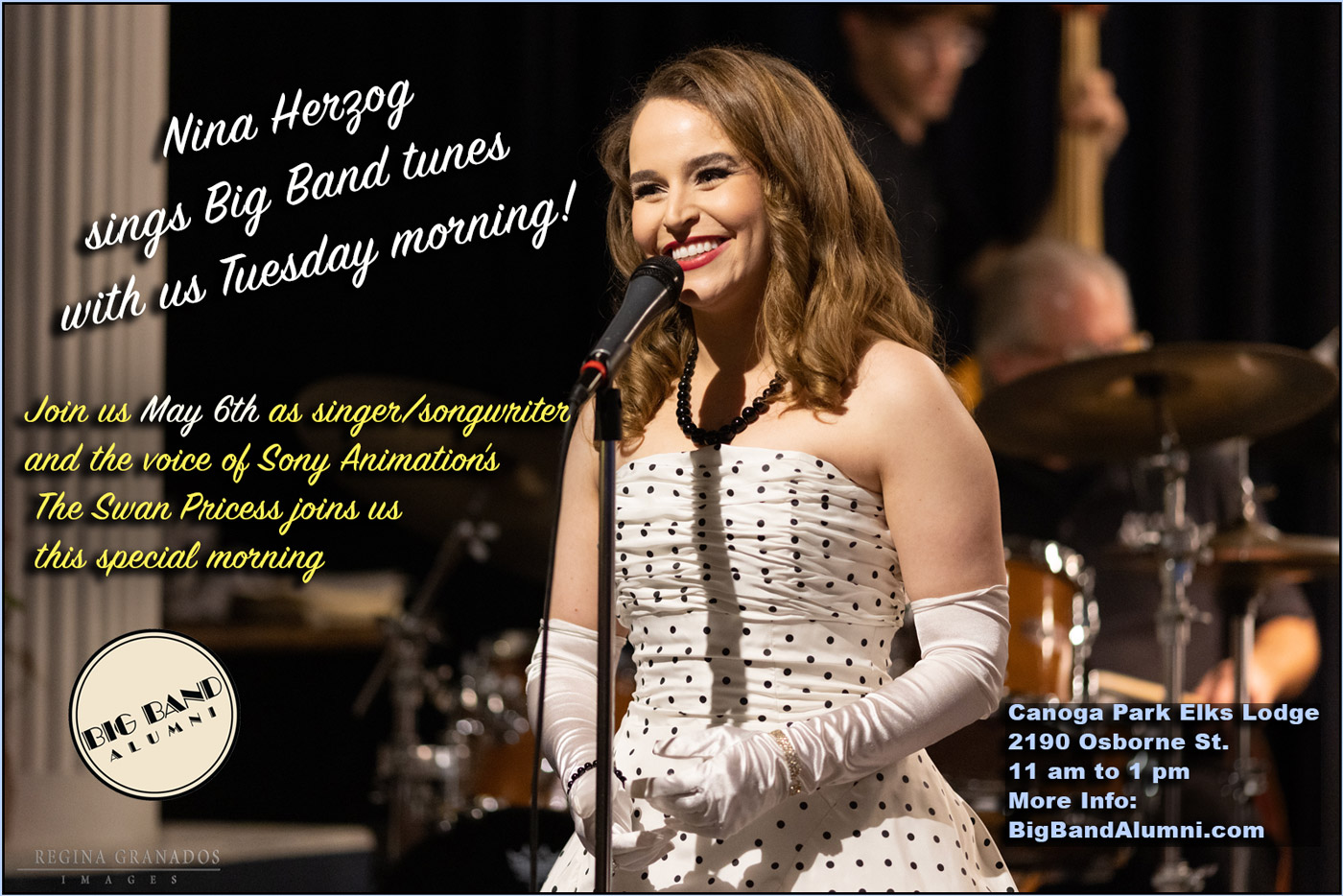 Nina Herzog sings Big Band Tunes with us Tuesday Morning, May 6, 2025 Written by:BBAPublished on:May 2, 2025 Join us Tuesday May 6, 2025 with special guest Nina Herzog singing Big Band tunes with the Big Band Alumni